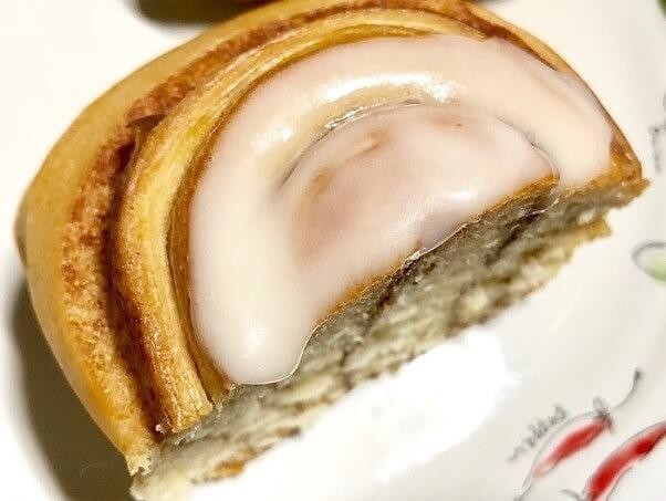自然解凍の場合は水分が閉じ込められたまま食べごろの状態になるので、ずっしりとした重みとしっとりとした食感になります。そして、フロスティングとシナモンの甘みが前面に感じられました。