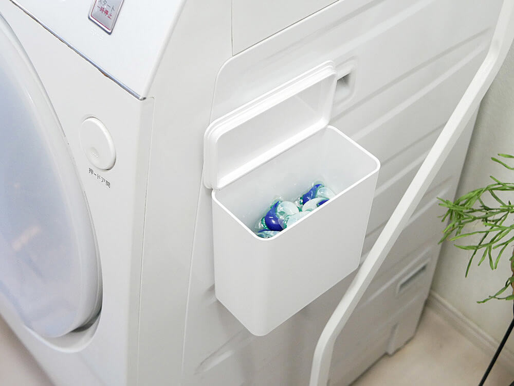 マグネットのつく場所といえば……洗濯機の横にペタっと! 洗剤類や洗濯バサミや洗濯ネットなどの細々したランドリーアイテムの収納にも◎。