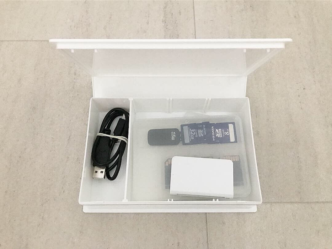 蓋つきの箱なので例えばパソコンを使う時に使うSDや接続機器をいれたり……。