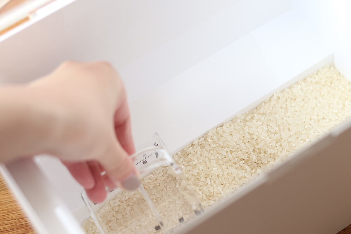 専用の計量カップもセットで、お米が少なくなっても最後まですくえる底の構造と冷蔵庫に収納できるサイズ感がオススメポイントです。