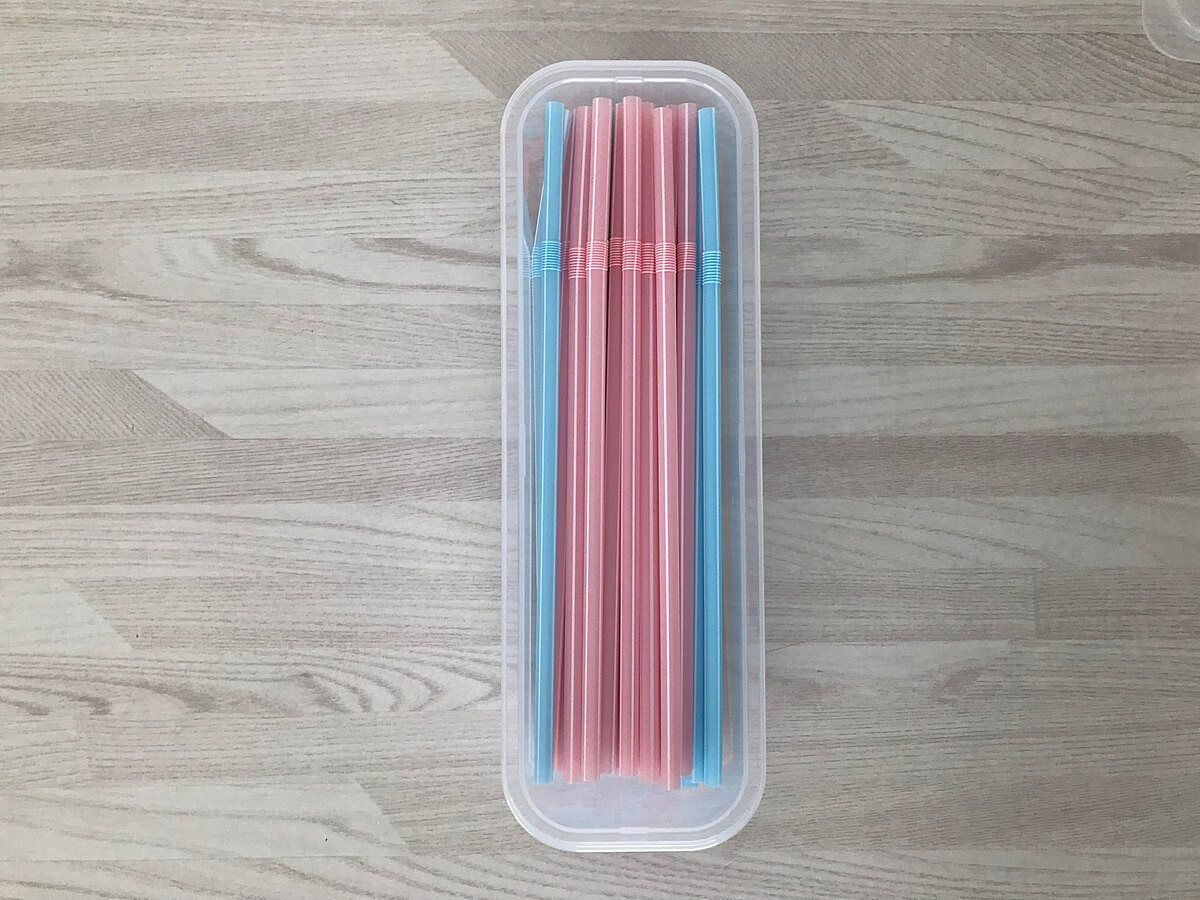 こちらは細長い容器なのでストローをいれてみました。ぴったりサイズでコンパクトに収納することができました。