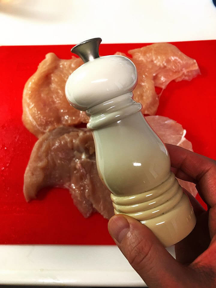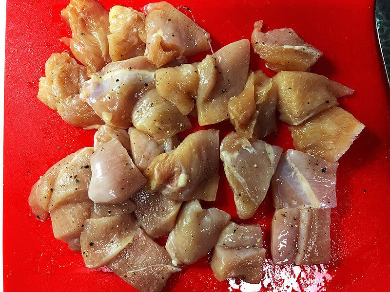 塩こしょうをふった鶏肉を一口サイズにカットします。