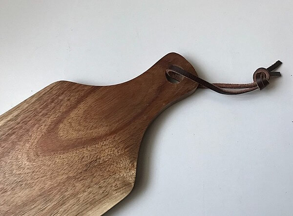 雑貨屋さんで売っているおしゃれなカッティングボードには、取っ手の部分に革ひもがついてあるのものをよく見かけます。