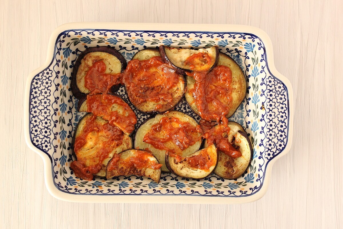 米なすは輪切りにし、オリーブオイルで両面をこんがりとやき、器に敷きつめます。 (もちろん、米なすではなく普通のなすでも大丈夫です!)