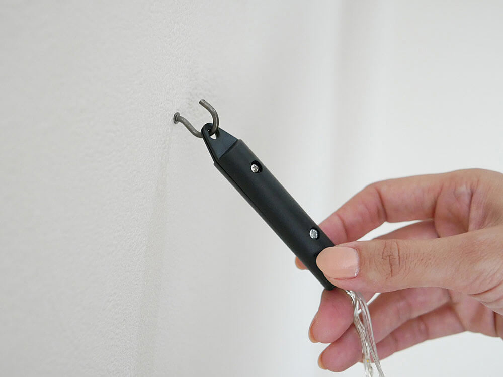先端には穴が空いているので、S字などに引っ掛けたり、細長いホルダーをどこかに差し込んんだりと設置は簡単です。