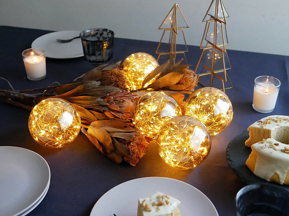 ハンギングせずにテーブルにコロンと直置きすれば個性的なテーブルコーデの完成です。存在感抜群の5つのボールで華やかな仕上がりに。
