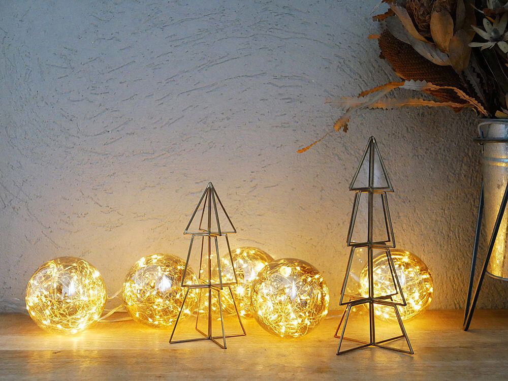 直径10cmのボールが5つ合わさり、ボリューム感のあるライトアップが可能です。天井からつるしたり棚やテーブルに置いたりとアレンジの仕方でクリスマスシーンはもちろん、雰囲気の違う楽しみ方が出来ますよ。