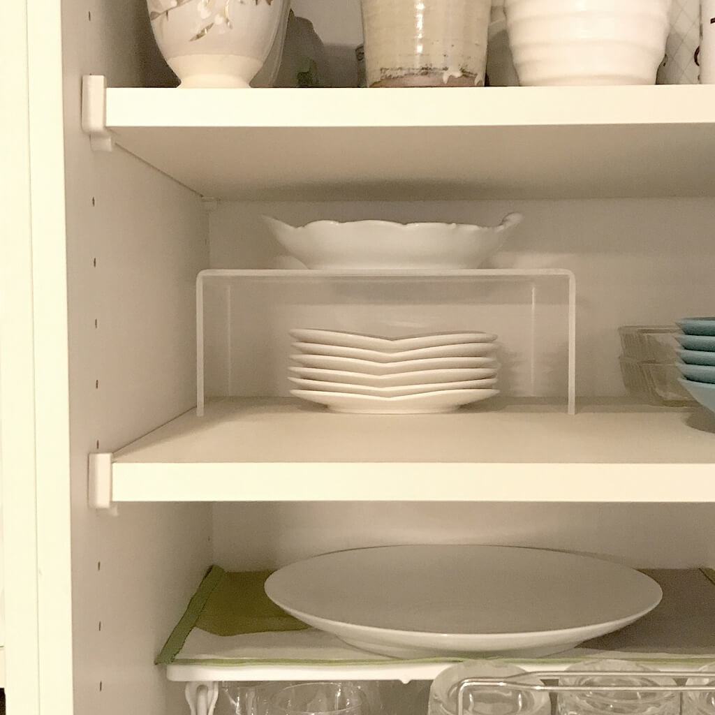 食器棚の中で皿を上下で分けて、取り出しやすく収納するのです。
