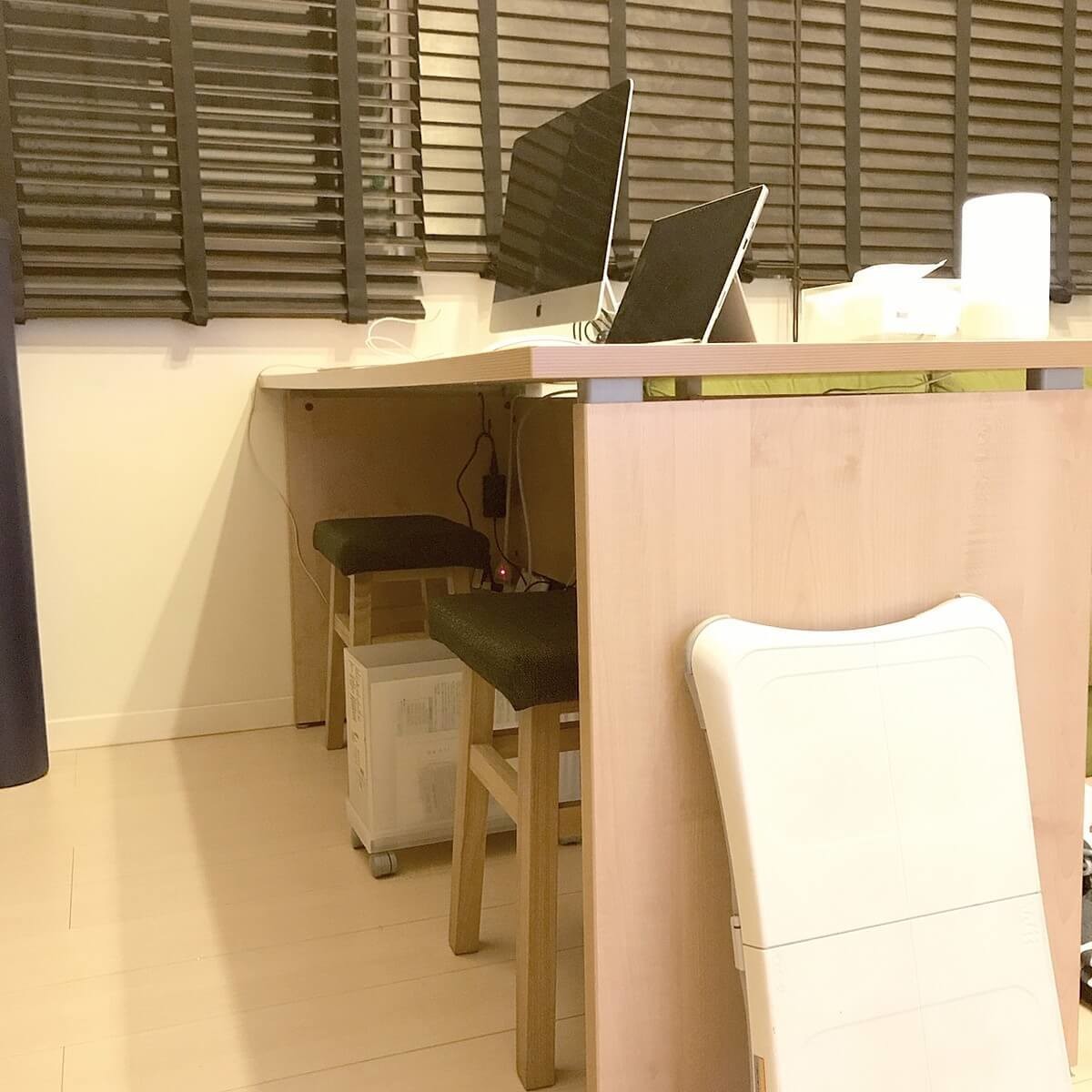 このデスクは二人用。子供たちも使いますが、デスクの右側で作業するときも、左側で作業するときも、カラカラと引き寄せればいいだけです。