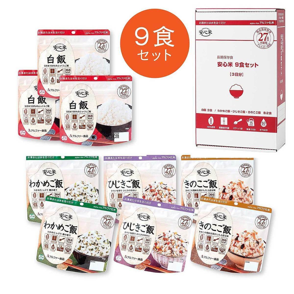 台風対策に限らずどんな災害にも備えておきたい、フェリシモの「非常食安心セット9食入り」です。 熱湯なら約15分、水なら約60分でおいしいごはんが食べられます。