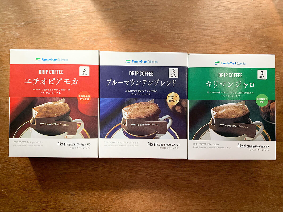 それぞれ3袋入りで、価格はエチオピアモカ・キリマンジャロは212円(税別)。ブルーマウンテンブレンドは298円(税別)です。