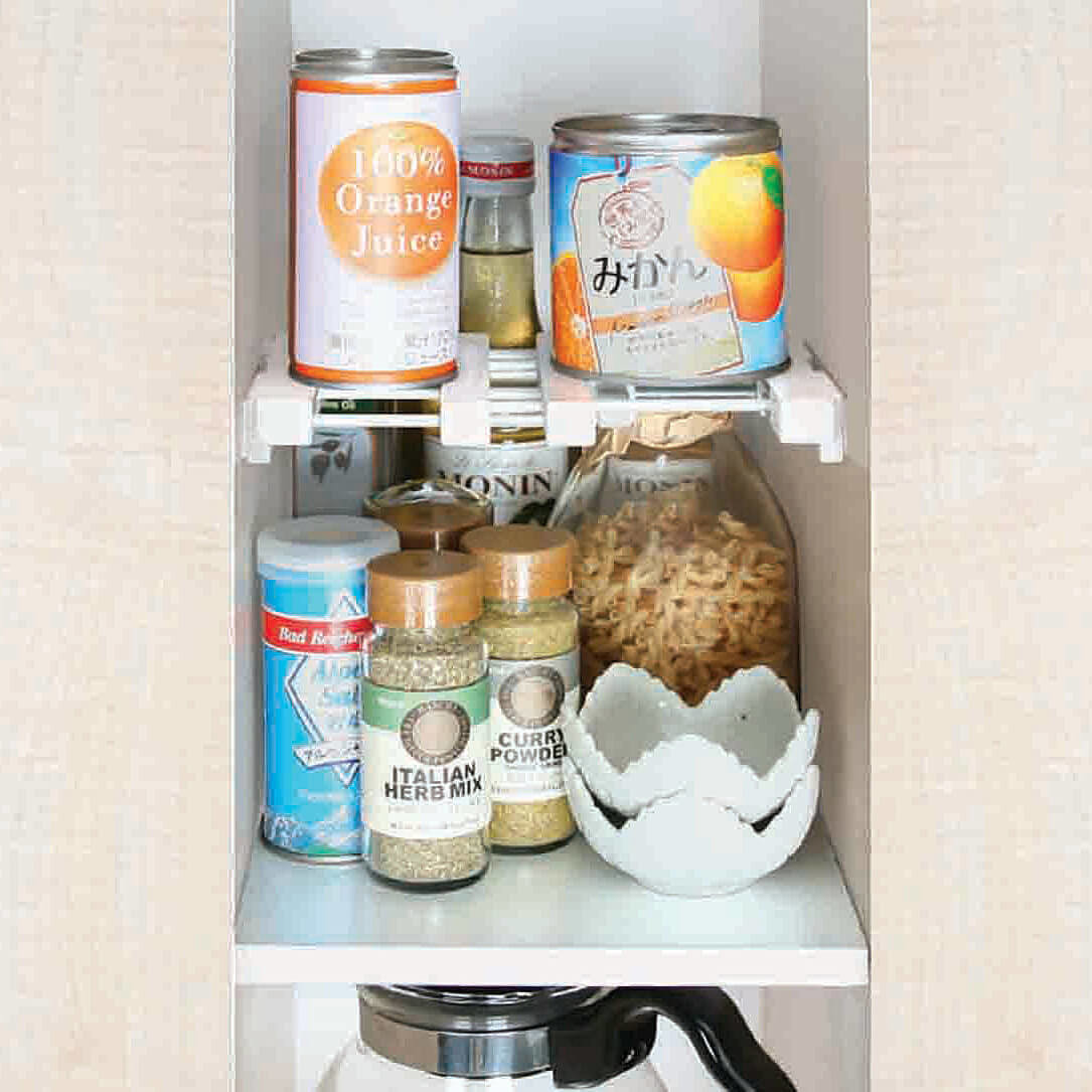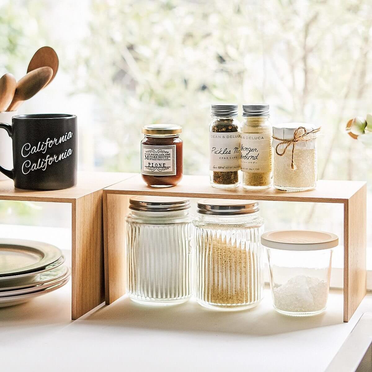 コの字ラックを食器や調味料の上に設置すれば、上下に収納できるようになり置くだけで収納力がアップします。あたたかみのある木目調は、収納場所を増やせるだけではなく空間のセンスアップも叶えてくれますよ。