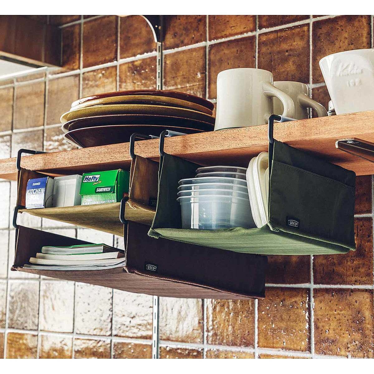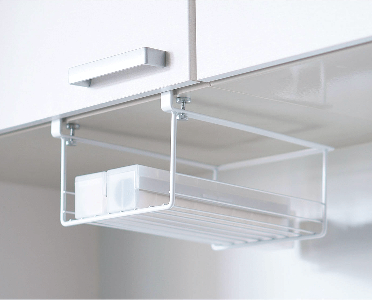吊戸棚下のデッドスペースには、フェリシモの「ハンギングラック」が便利です。 ラップやキッチンペーパーの置き場所にしたり、フックを引っ掛けて吊り下げ収納にしたり、アイデア次第で色々な使い方ができます。