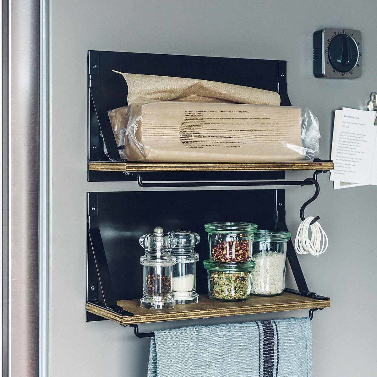 棚部分には天然木を使用しており、スチールとの異素材の組み合わせがとってもおしゃれ。 マグネット仕様で取り付けも簡単なため、手軽に収納スペースを増やせるところが嬉しいですね。