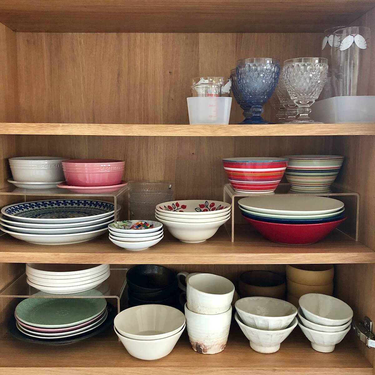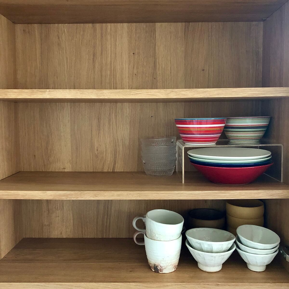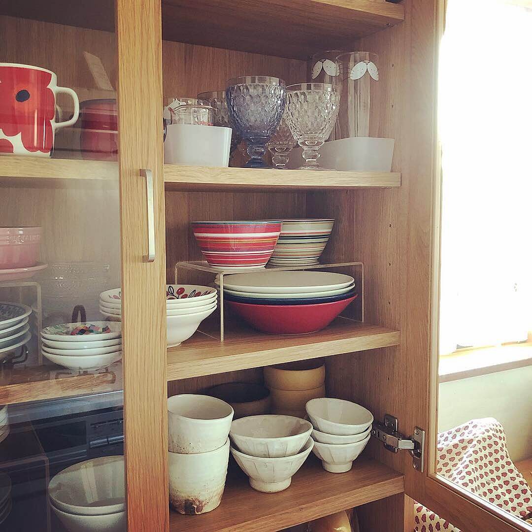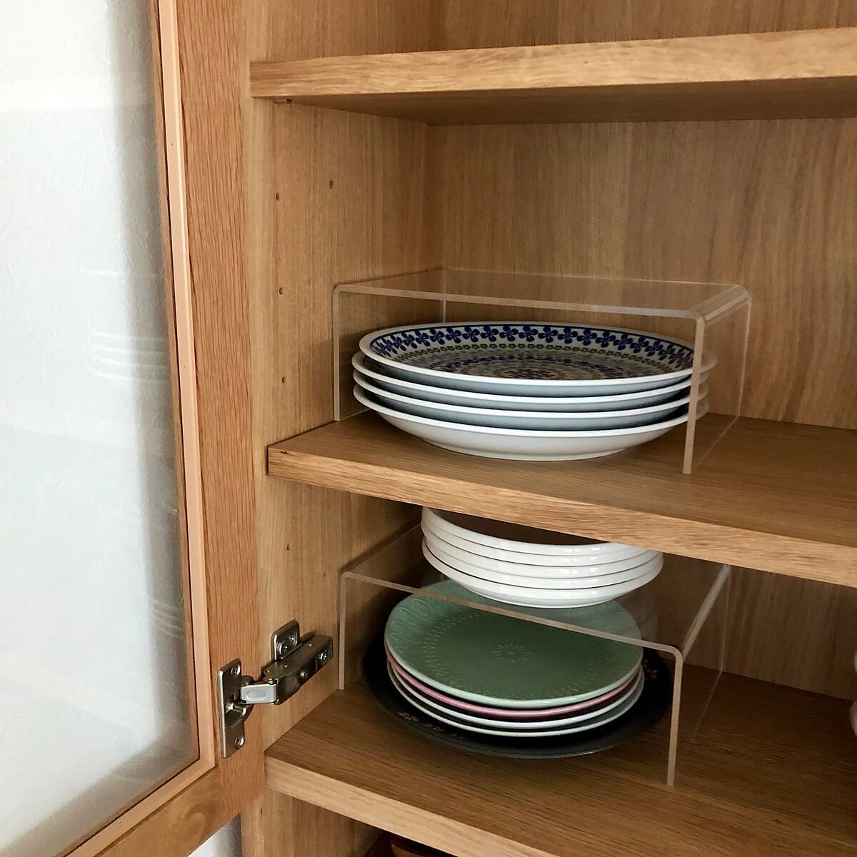 無印良品の「アクリル仕切り棚」は透明でシンプルな造りなので、取出しやすく、食器棚の中をすっきり見せることができます。