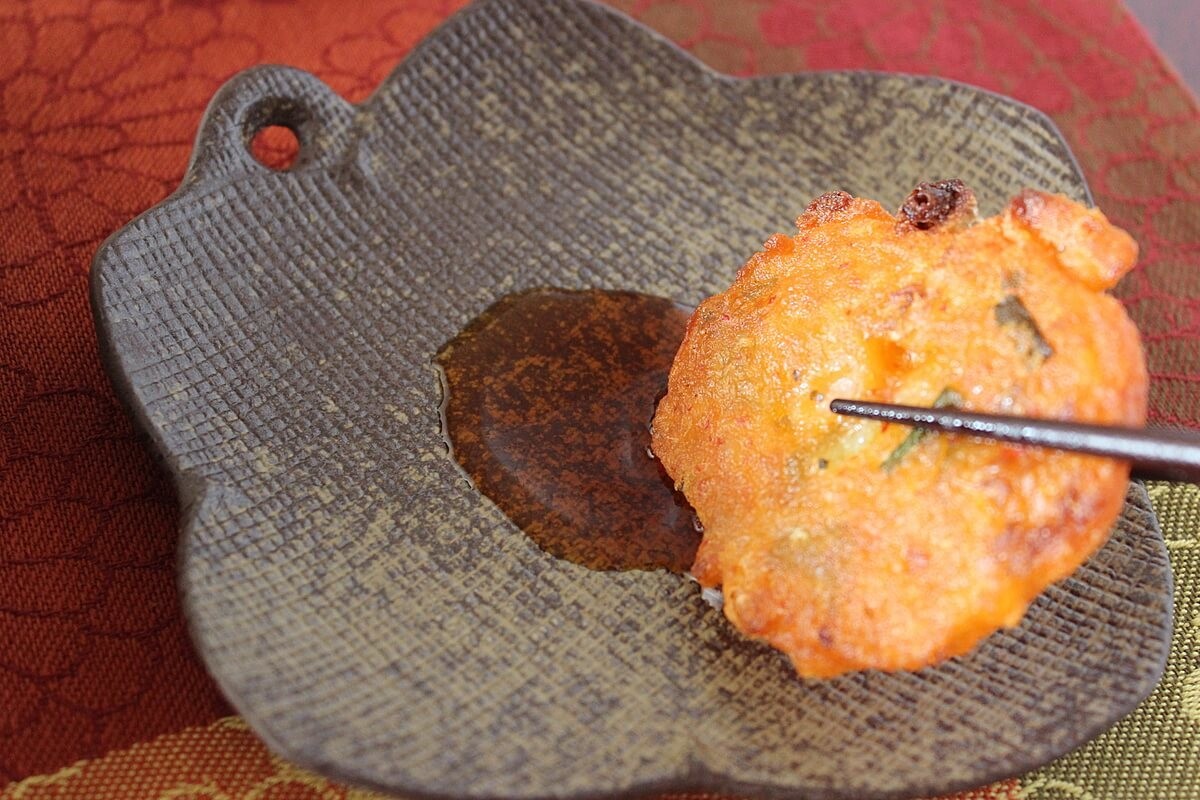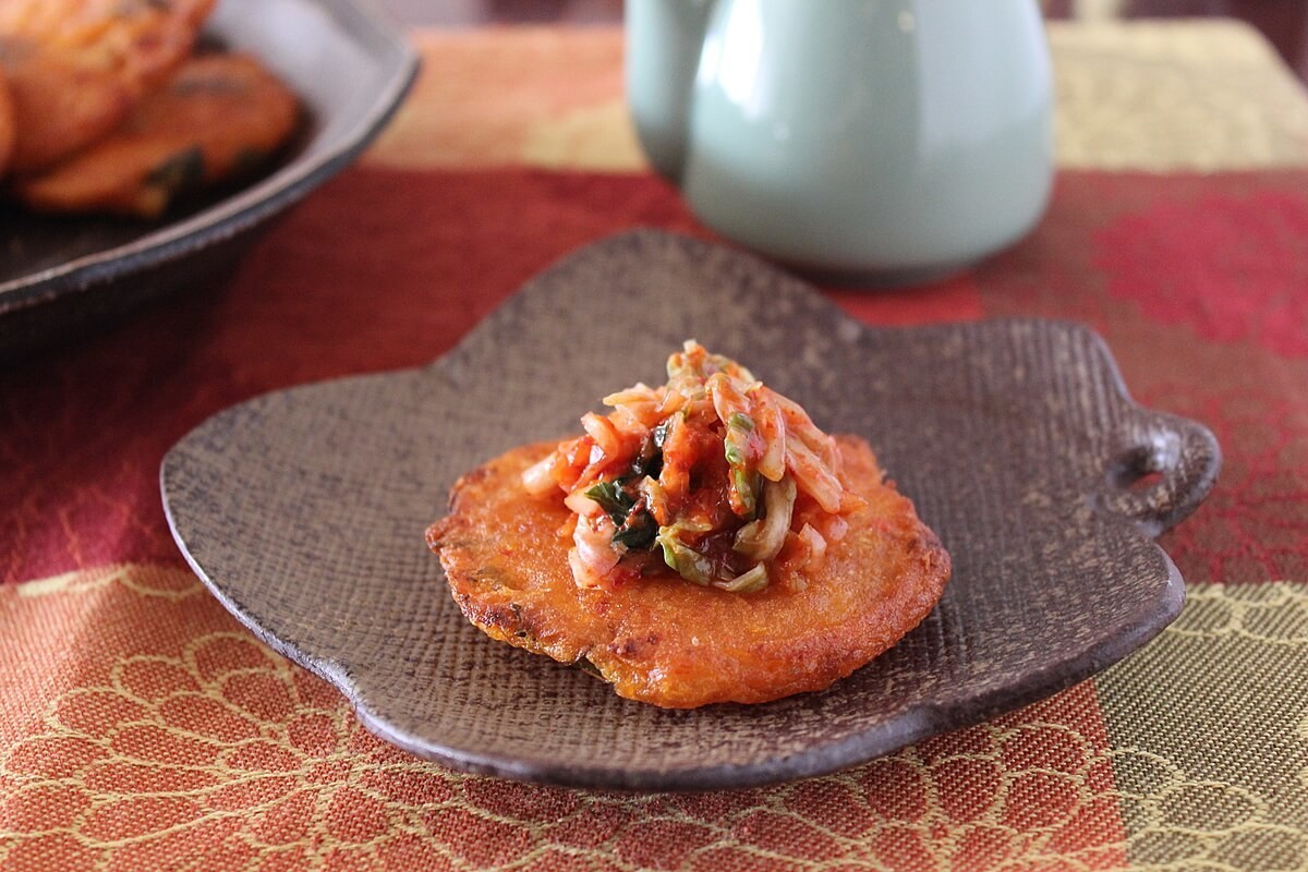 さらに、ポン酢やお醤油を少々つけてから冷たいキムチをオン!したりすると、熱々のチヂミと冷たいキムチのコラボがなんとも言えない美味しさに!