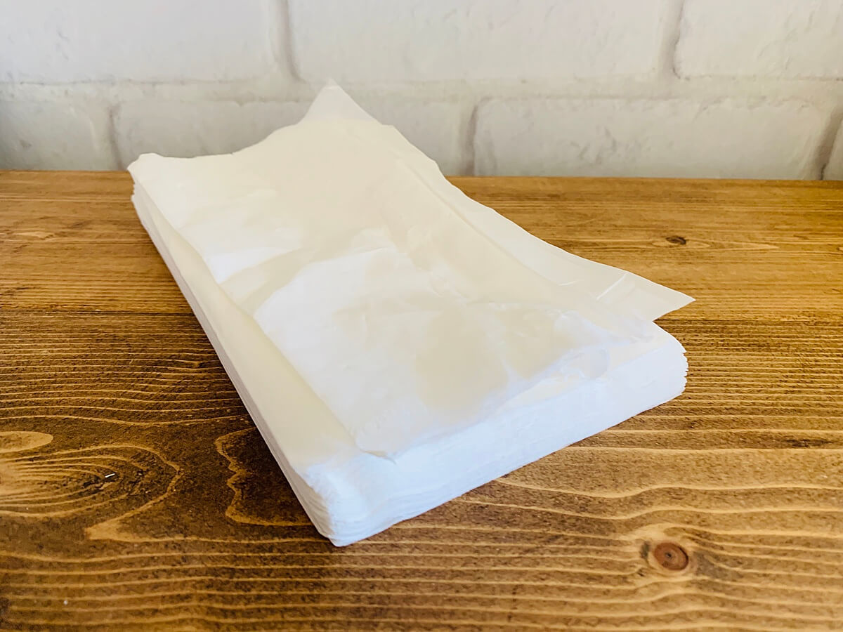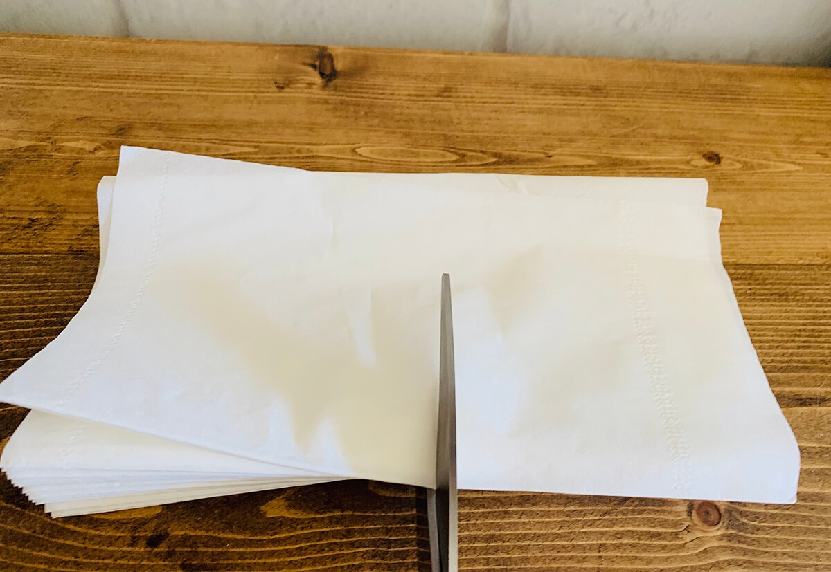 通常サイズのティッシュ30組くらいを真ん中から半分にカットします。