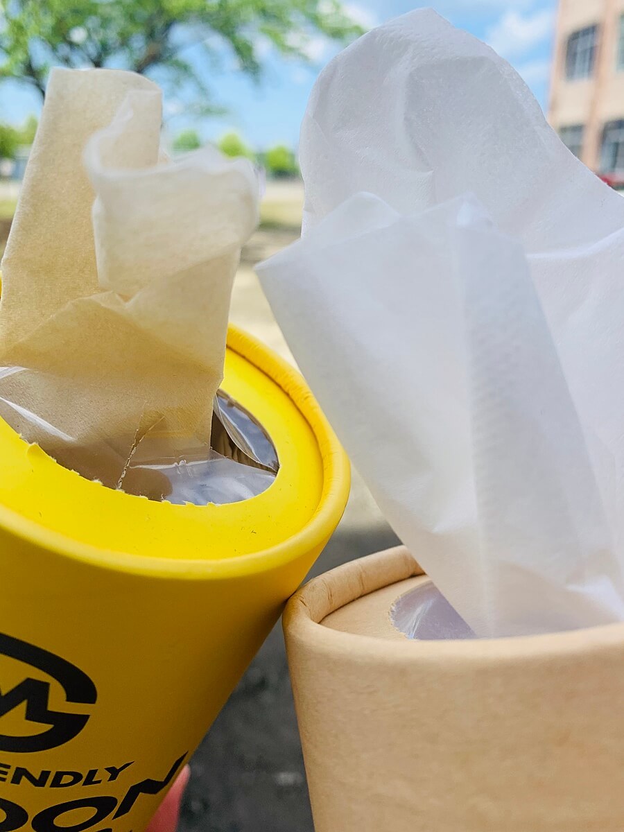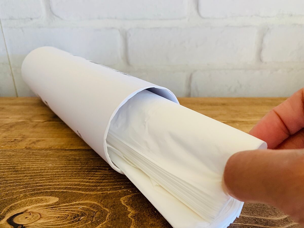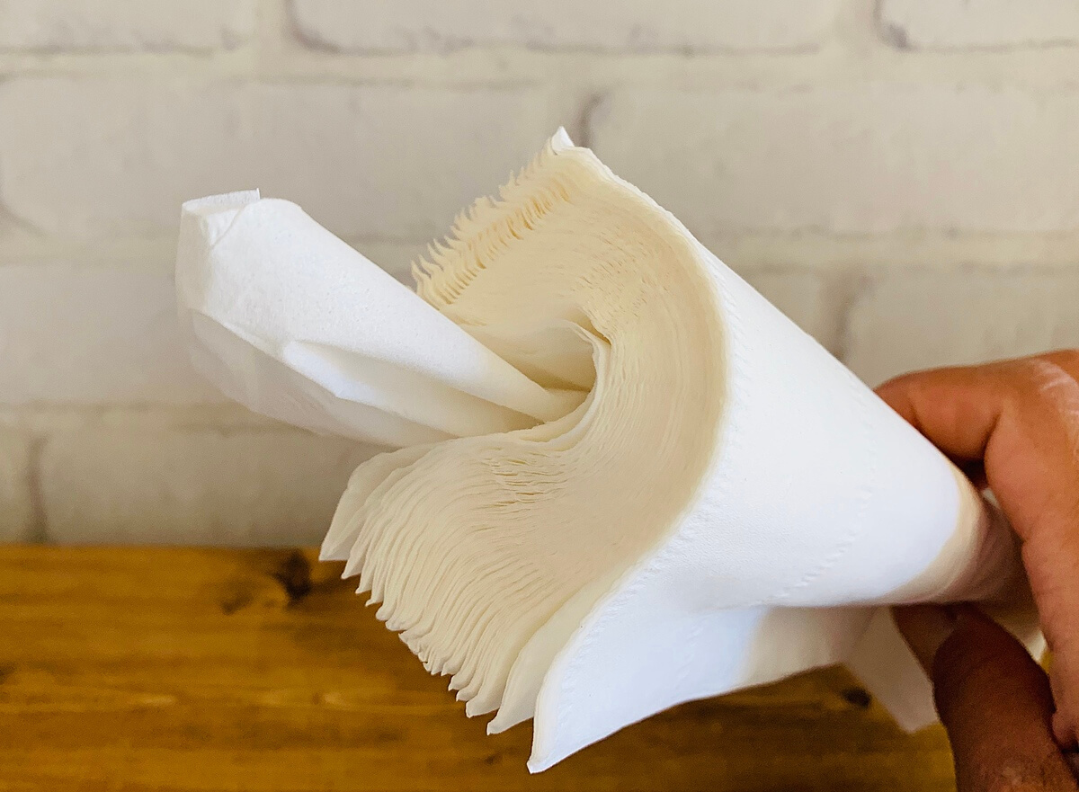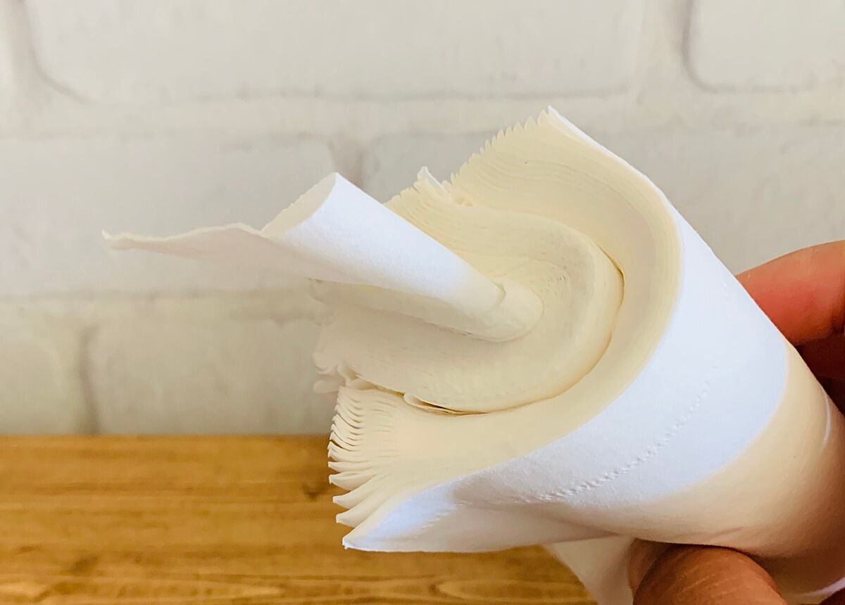 カットした両方を重ねて60組にしたら、折り曲げて真ん中から1組引き出して筒に入れたら詰め替え完了です。