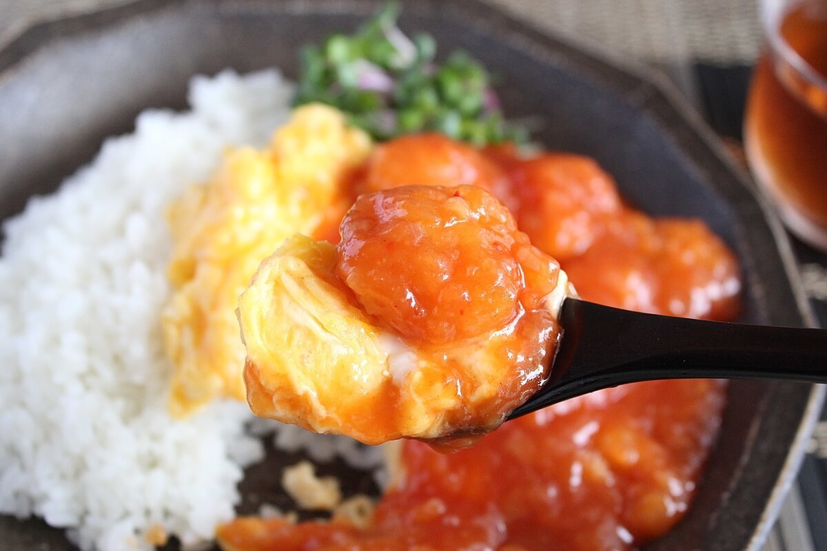 ご飯を盛り付け、味付けをせず半熟で仕上げた入りたまごをのせ、温めたエビチリソースをのせるだけ!