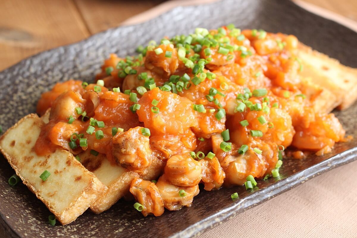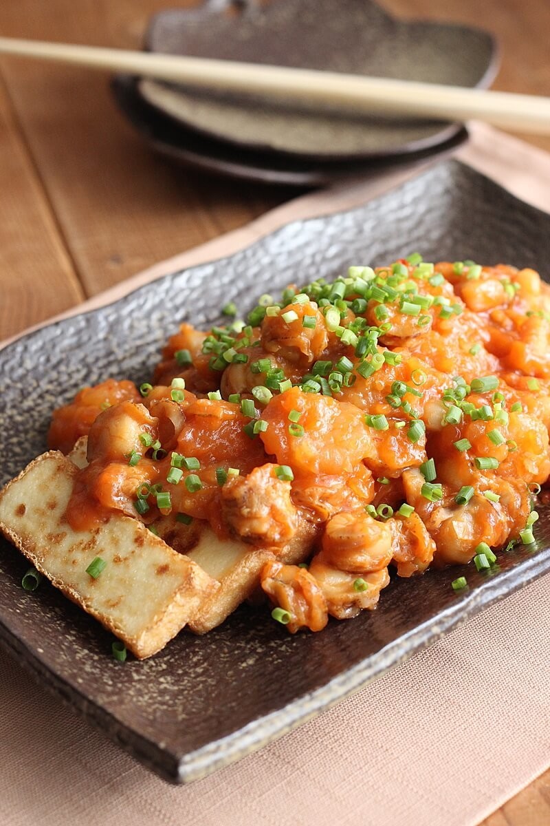 ベビーホタテはごま油で焼き、そこへレンジか湯せんで加熱したエビチリを入れ味を馴染ませ、厚揚げの上にかけていただきます。