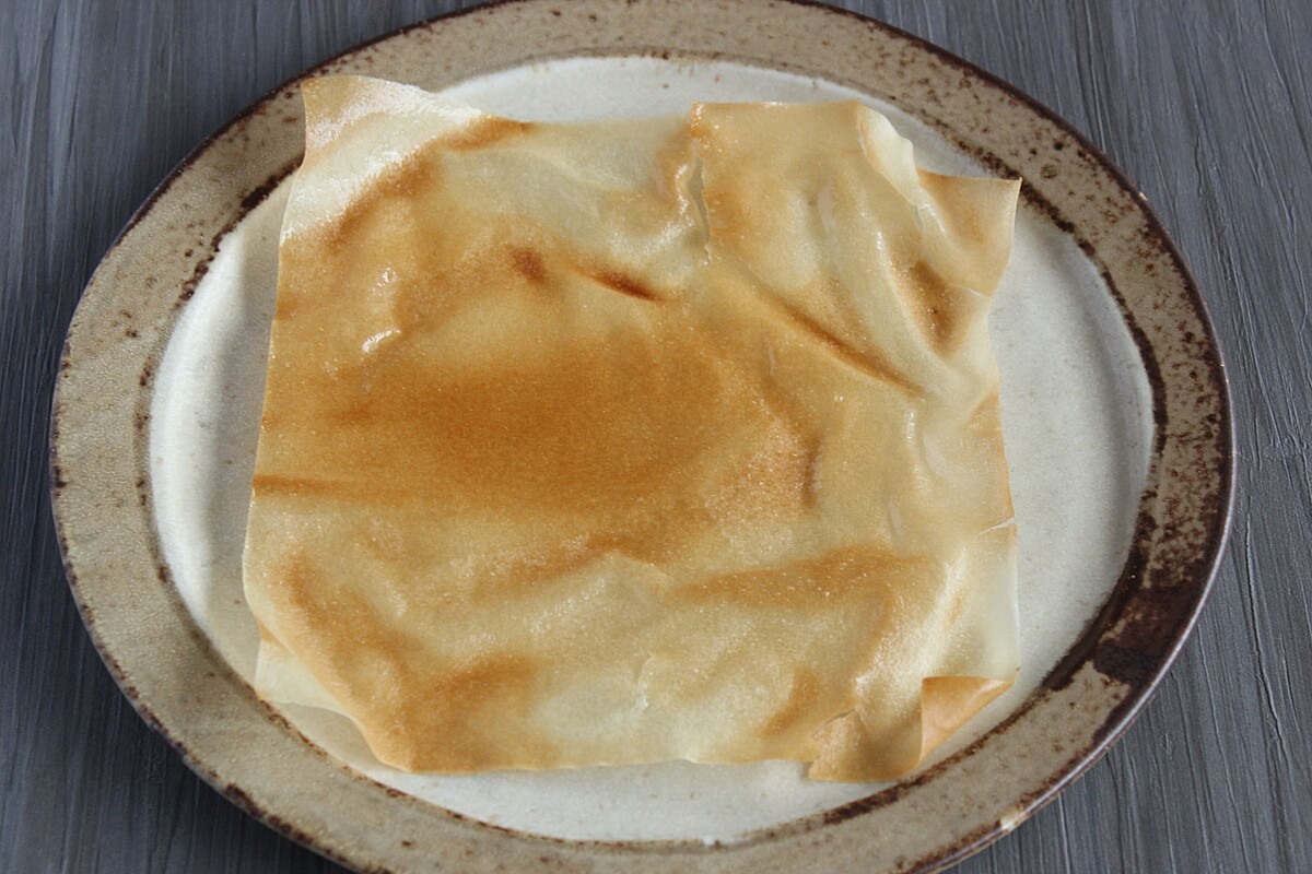春巻きの1枚は、大さじ2ほどの加熱した油に入れ、両面をこんがり焼きます。