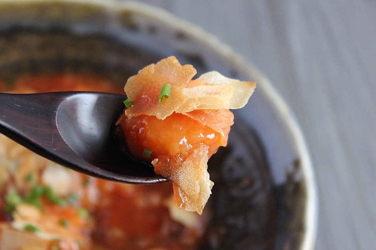そして箸やフォークでつついて崩し、温めたエビチリの上にかけるだけ!