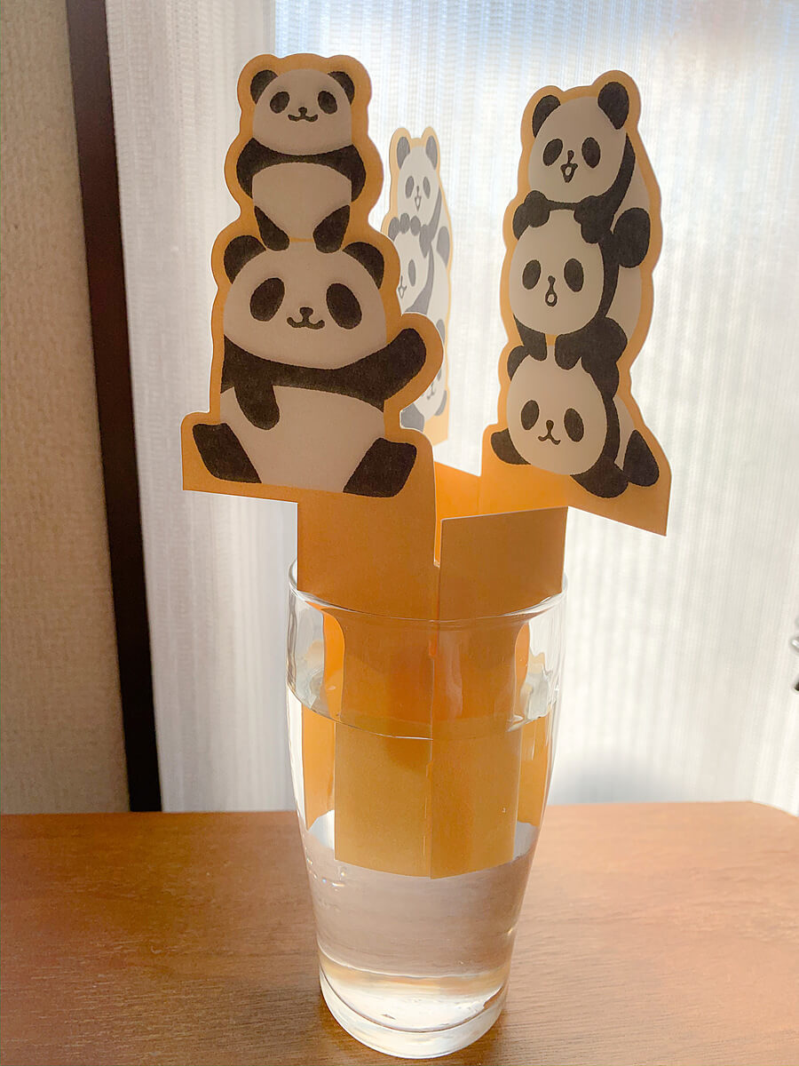 三角形に折り曲げて、ベロの部分を差し込めばすぐに組み立て完了です。 組み立てたら、水を注いだコップに刺します。これだけで、ペーパー加湿器として利用することが可能です。