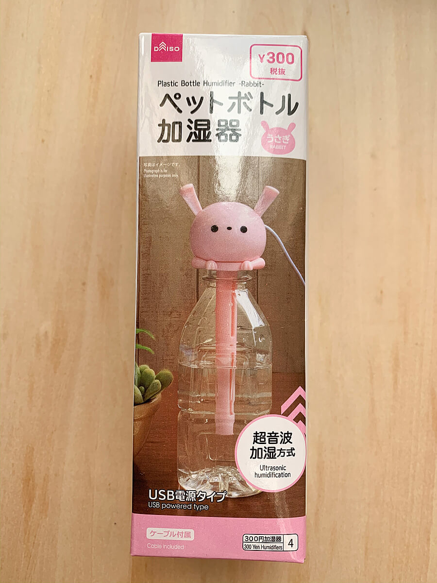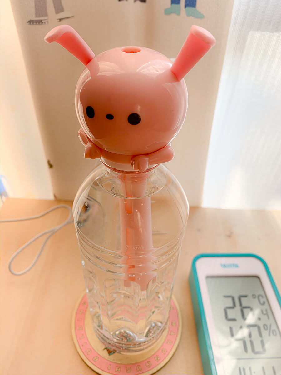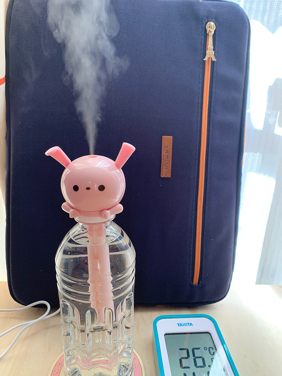 日を改めまして、同じ26度設定のエアコンを付けている8畳の部屋の中で実験です。 今度は、超音波加湿方式のペットボトル加湿器を使用してみます。 ダイソーで300円(税別)です。