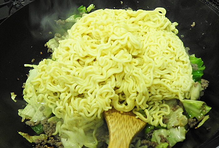 - 麺や具材に火が通ったら、付属の粉末ソースをかけ、よくかき混ぜたらできあがり