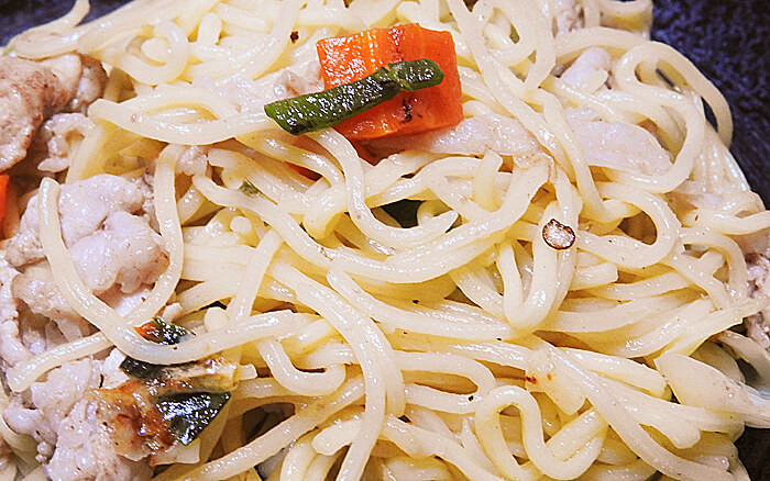 塩焼きそばを作っている最中から漂ってくる塩の香り。当たり前ですが、見た目はやや白っぽいですね。塩ソースにコショウが多めに入っているからか、ちぢれ麵にコショウがついていますね。