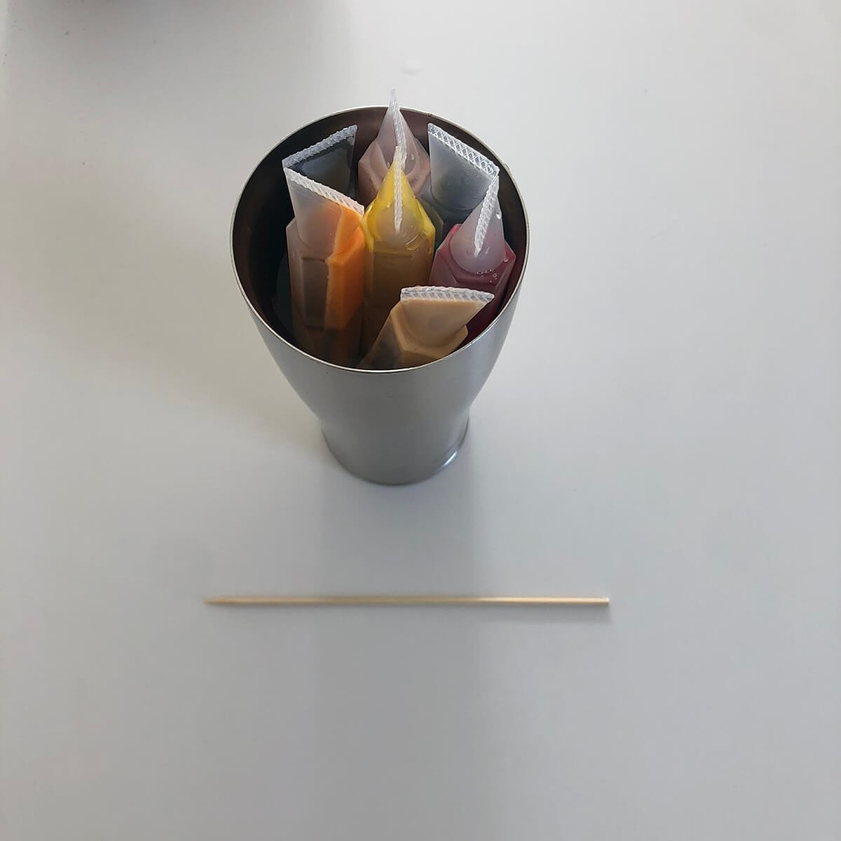 使う色のチョコペンを45度〜50度くらいのお湯につけて柔らかくします。温度を保つ為に魔法瓶タイプのコップを使うと良いです。