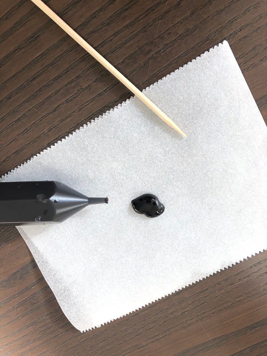 先ほどのペンでなぞったクッキングシートを裏にして黒のチョコペンをお皿などに出して竹串につけ、枠を描いて行きます。