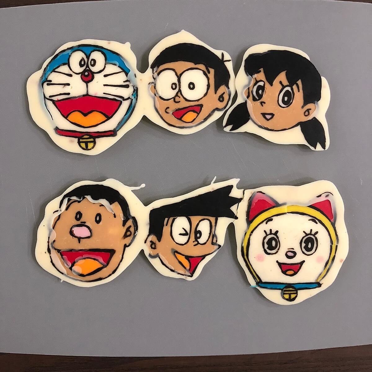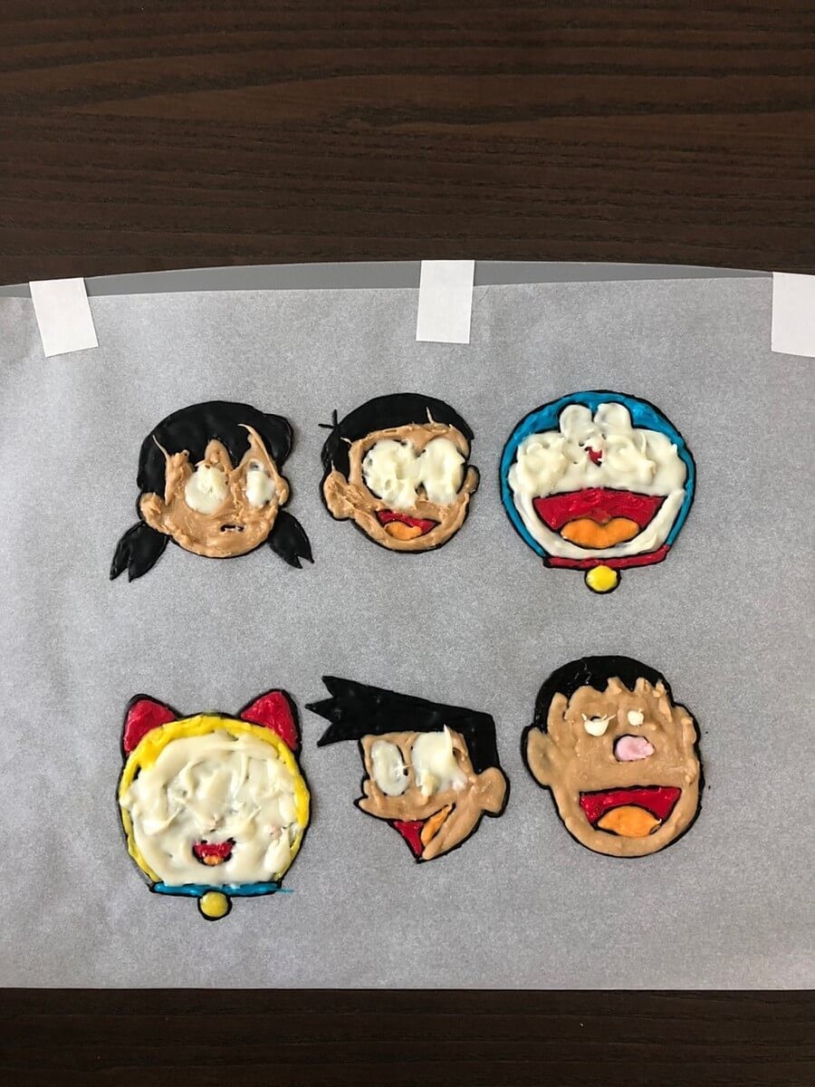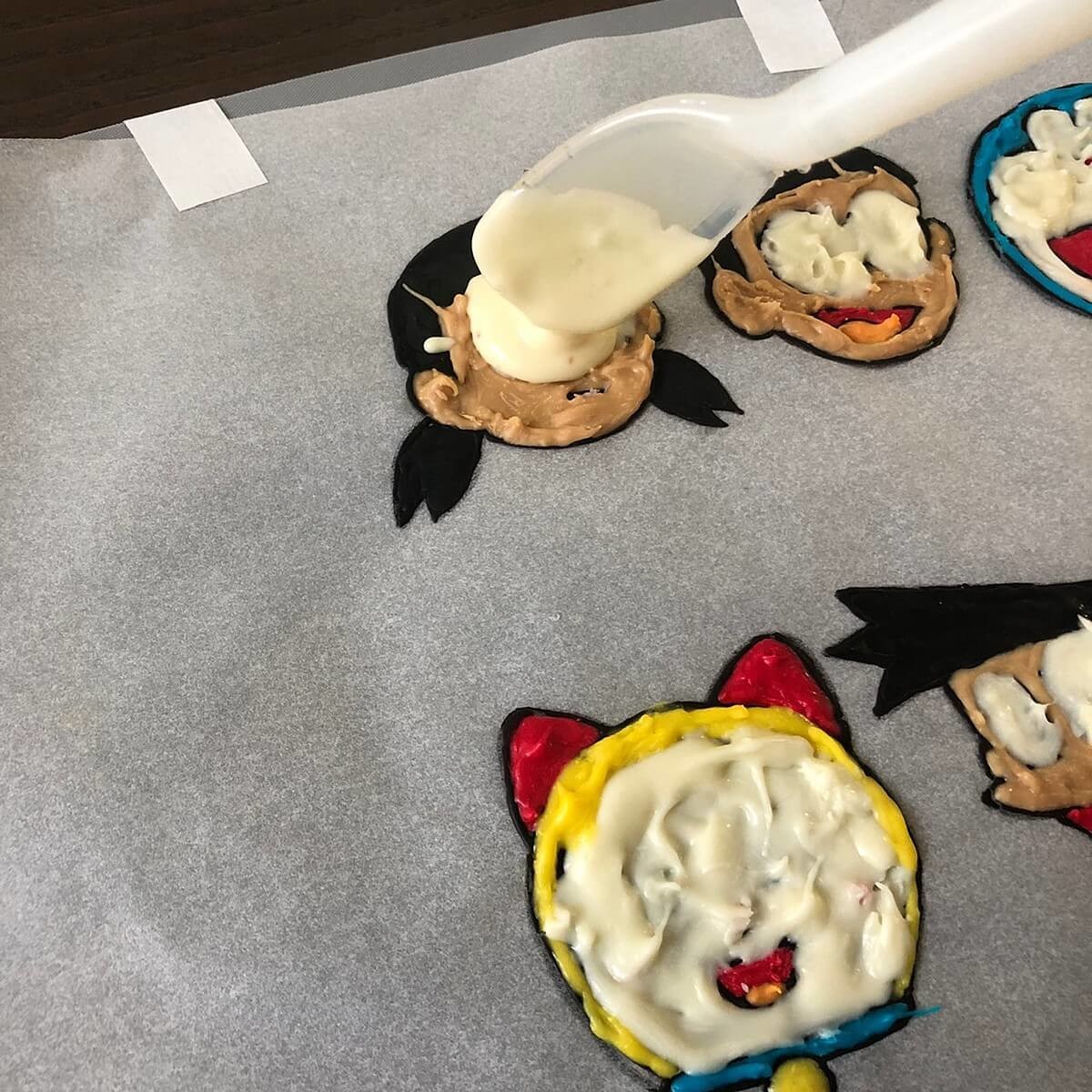 全て色が埋まって固まったら、湯煎で溶かしたホワイトチョコや余ったチョコペンなどをある程度厚さがでるまで重ね補強し、冷蔵庫で固めます。