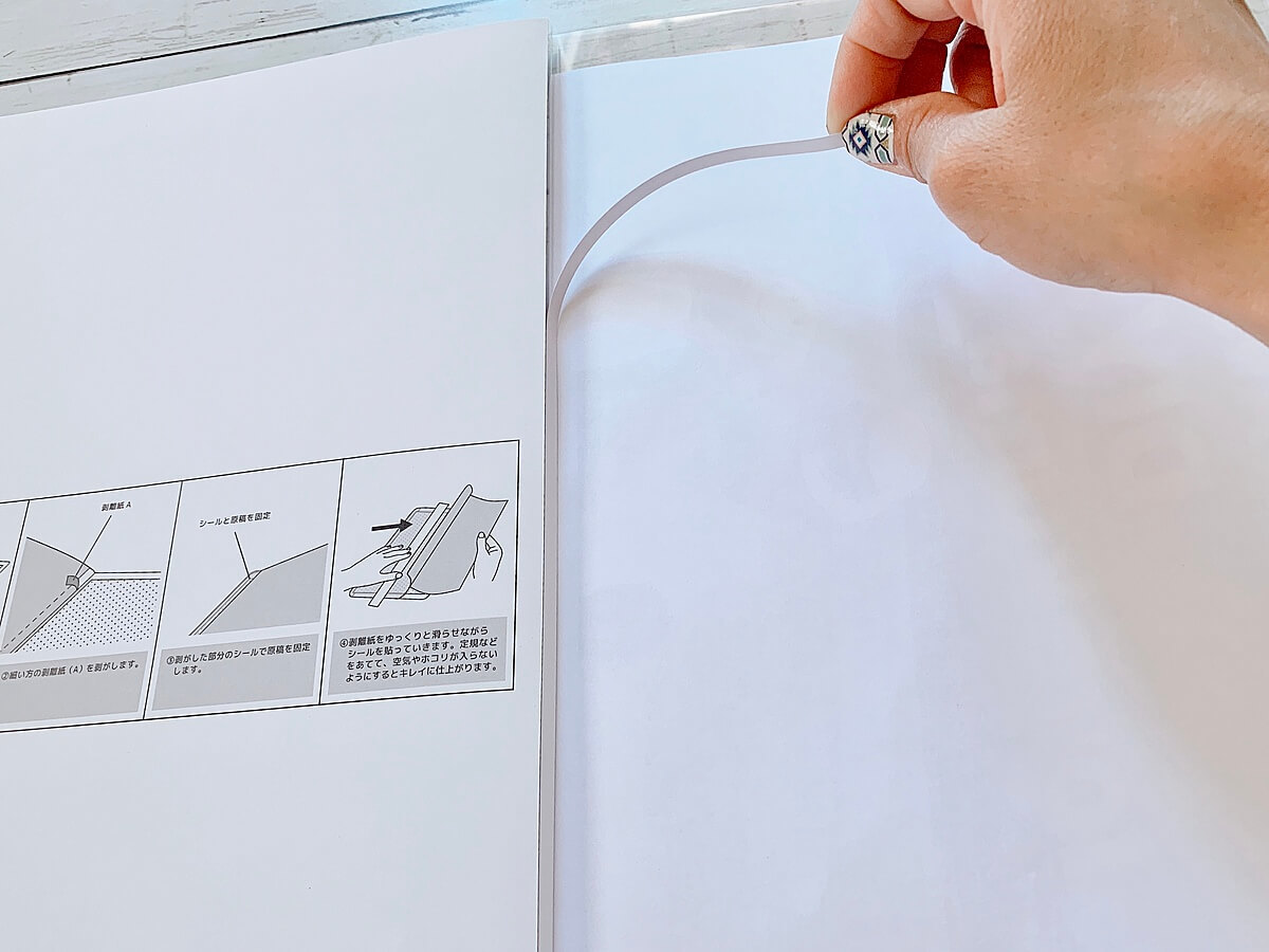 大きな剥離紙を剥いでいきます。右側へスライドするように空気を抜きながら貼っていきます。