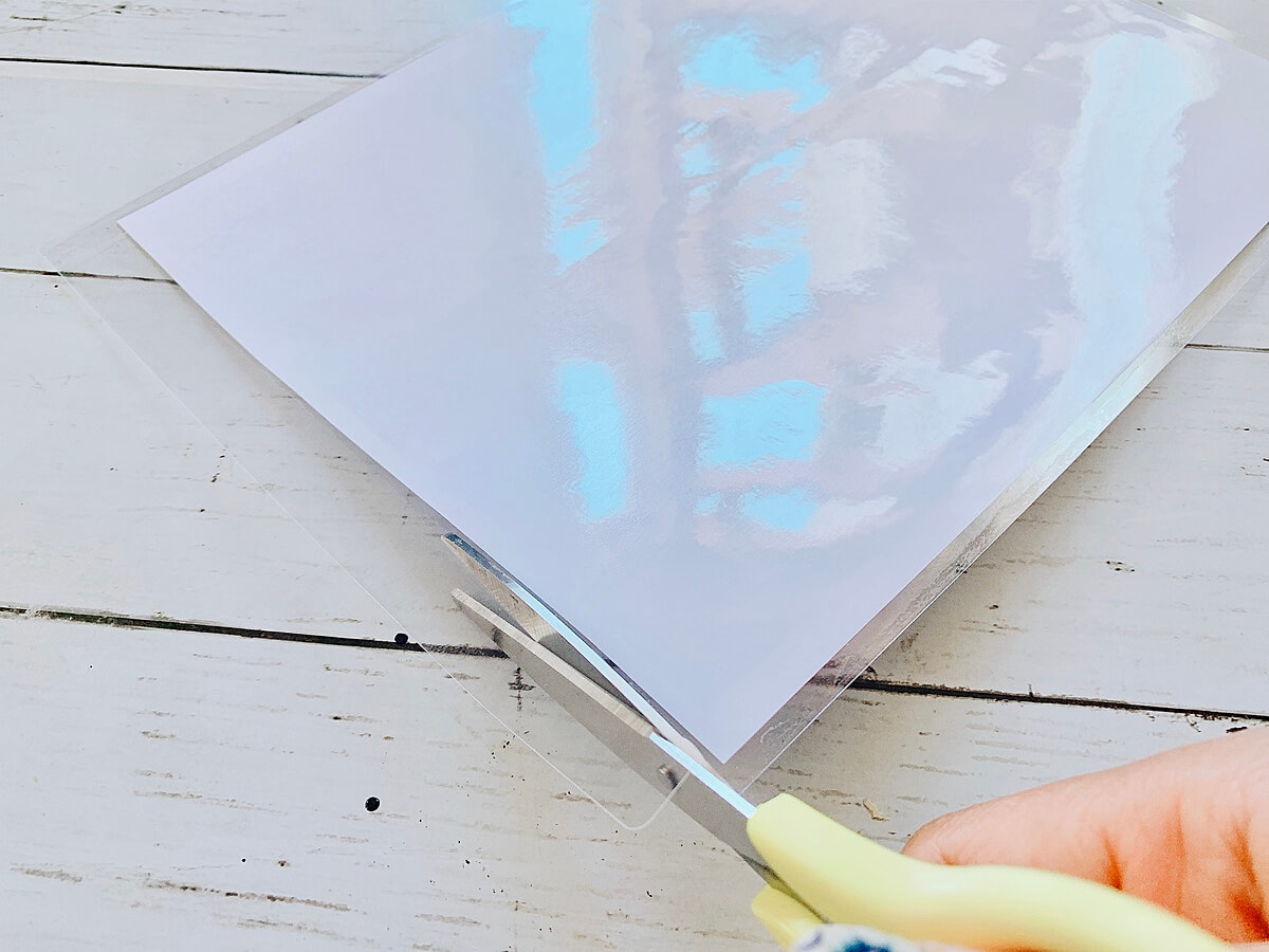 細い剥離紙をゆっくり剥がし、粘着面を下のフィルムと合わせます。