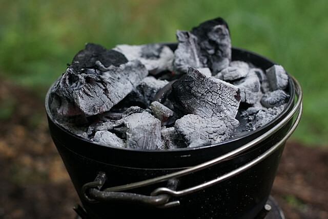 「ダッチオーブン」とは、蓋のついた金属製の分厚い鍋のこと。蓋が水平になっているのが特徴で、蓋の上に炭火を置くことができます。こうすることで上下から熱を当てることができるため、一般的な鍋よりも中にある食材全体に満遍なく火を通すことが可能。