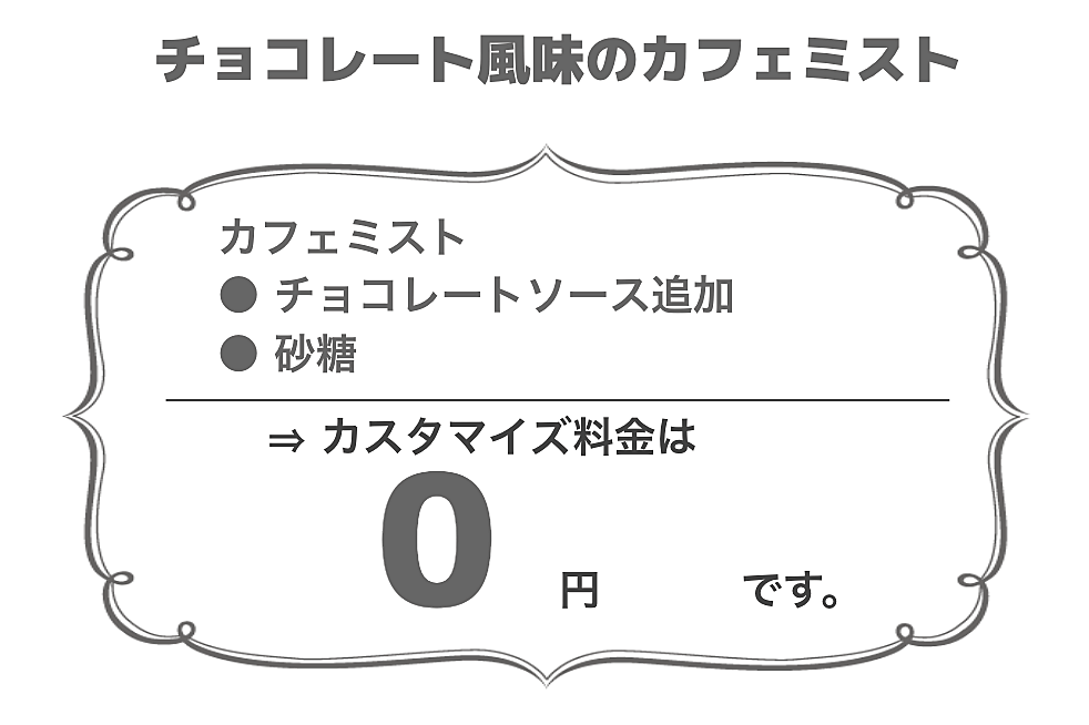 こちらは、カフェミストに砂糖とチョコレートソースをトッピングしたカスタマイズドリンク。