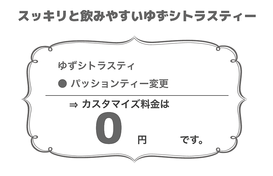 こちらは、人気のゆずシトラスティーに使用されている紅茶をパッションティーに変更したカスタマイズドリンクです。