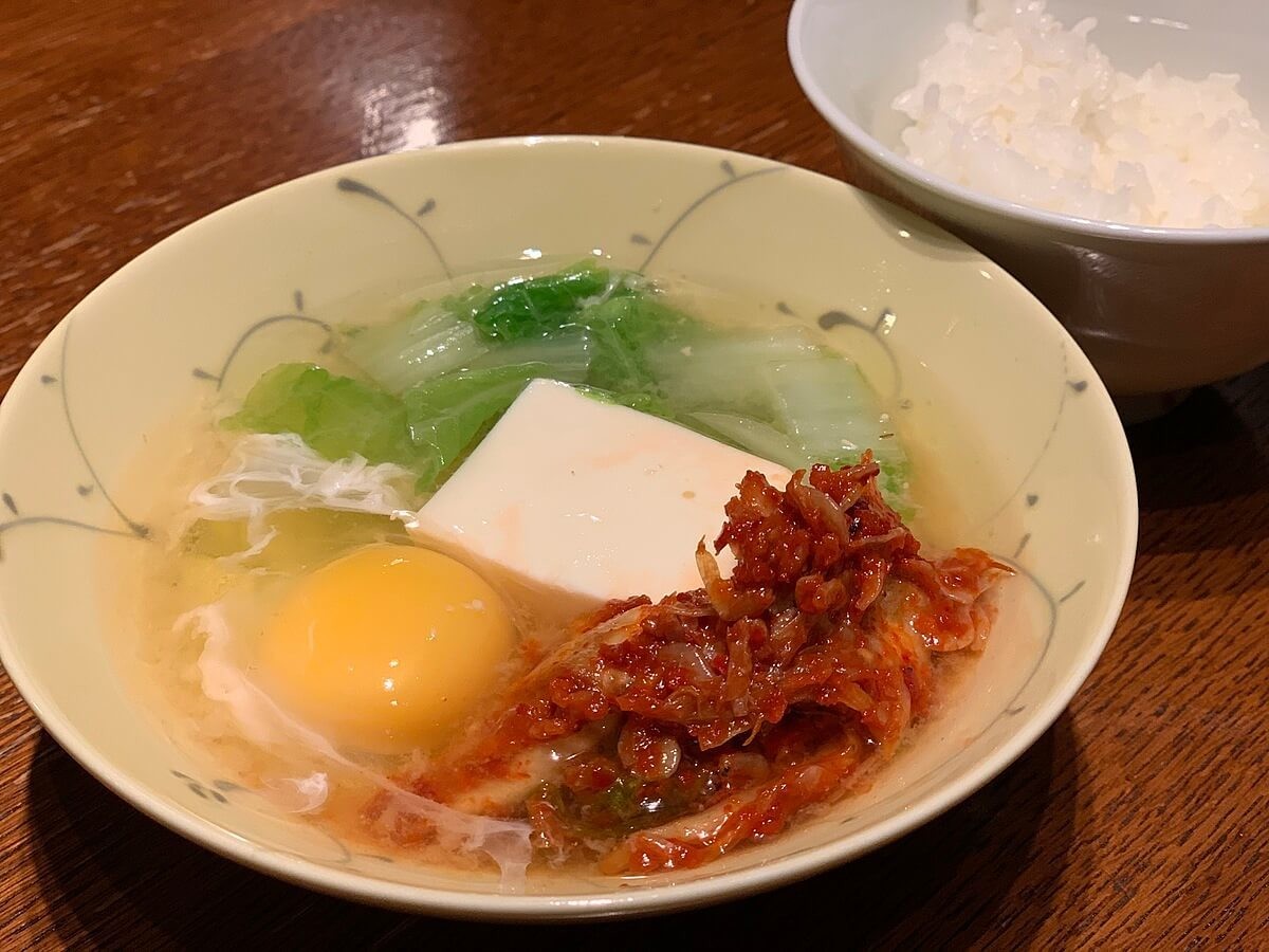 深めのお皿に豆腐の味噌汁をたっぷり入れ、キムチと生卵を投入