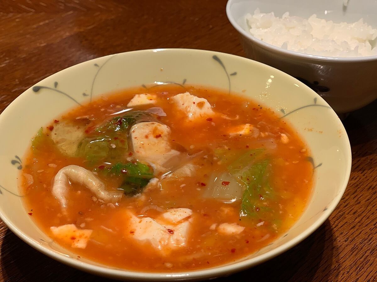 韓国料理の中でも、ファンの多いスンドゥブですが、実は豆腐の味噌汁とこちらのキムチで簡単に再現できてしまいます。入れて混ぜるだけですが、成城石井「海老の旨味たっぷり白菜キムチ」は干し海老の出汁がきいているので、スンドゥブの風味に仕上がります。