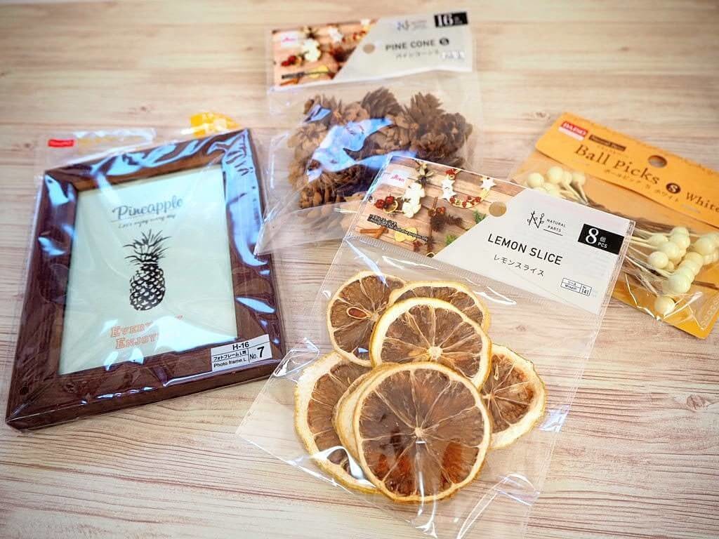 私はレモンスライス、パインコーン、ボールピックを選びましたが、グルーガンは素材を選ばないのでパーツはお好きなもので構いません。
