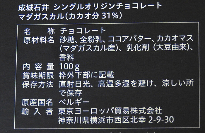 「成城石井 シングルオリジンチョコレート(カカオ分31%)」のパッケージを見ると、原産国名はベルギーになってますね。輸入者の欄に書かれている「東京ヨーロッパ貿易株式会社」は、成城石井のグループ企業です。
