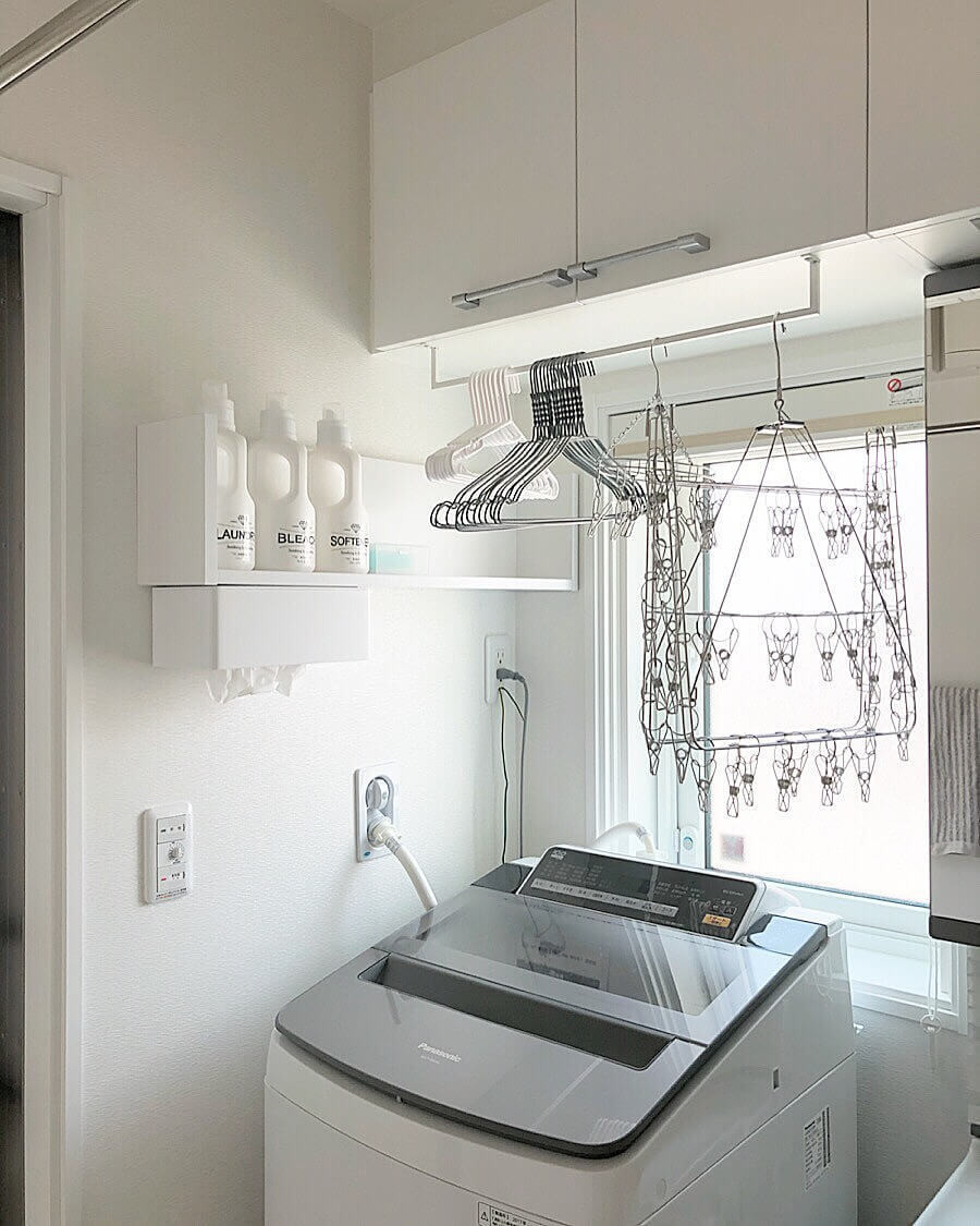 洗濯物を洗濯機から取り出す〜洗濯物をハンガーに掛ける作業までは、ハンガー類が洗濯機の真上に置いてあるので、洗濯機の前から一歩も動かずにできるので家事動線的にもすごく使いやすいです。