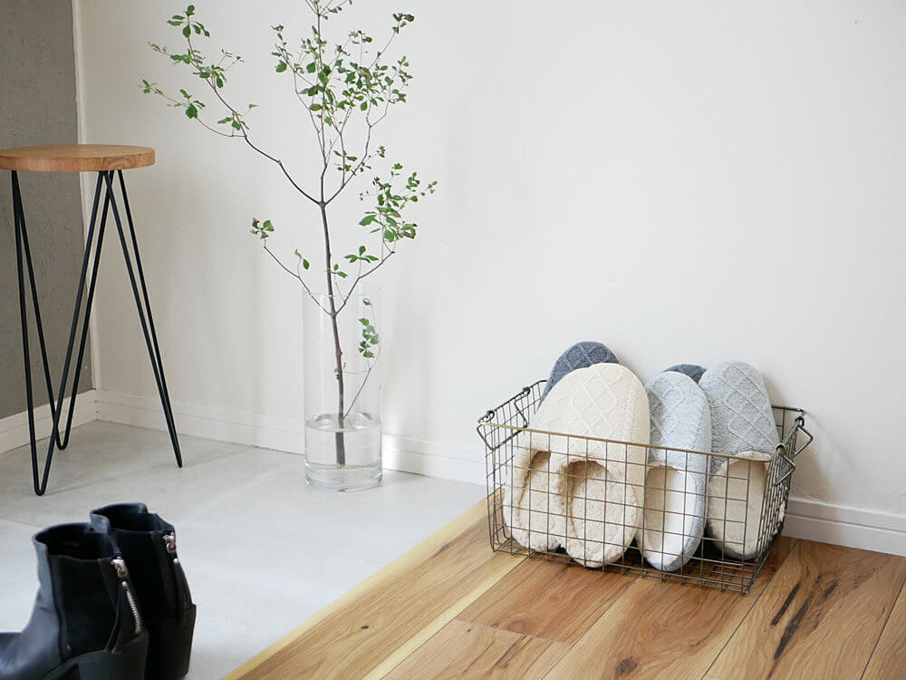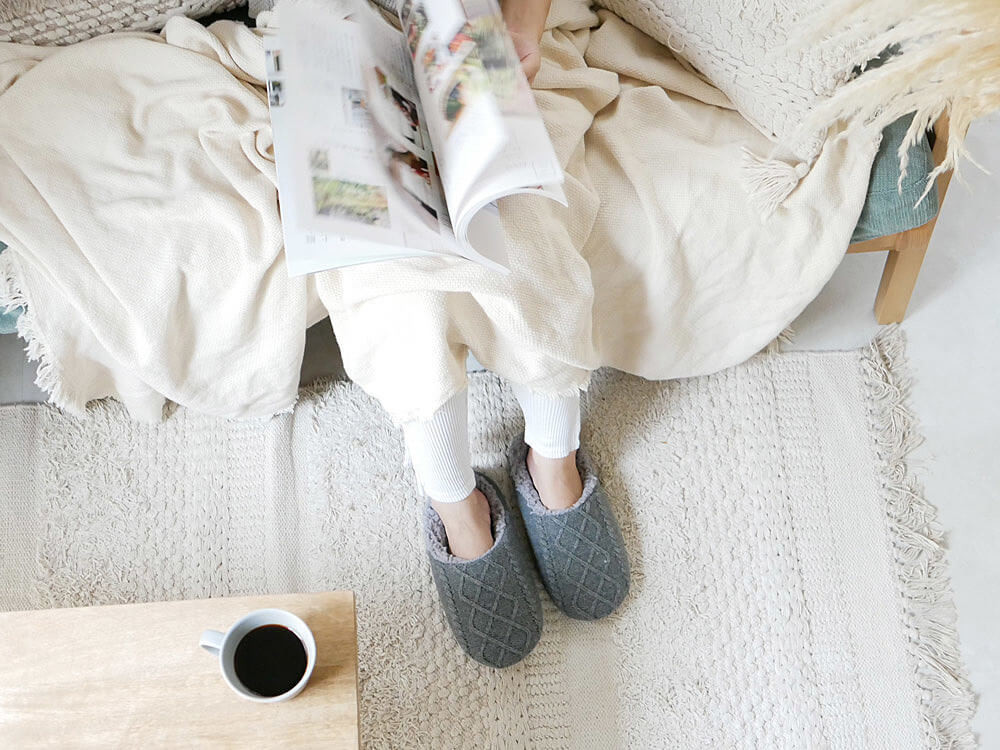 スリッパだけでなく、ラグやクッション、ブランケットなども同じニット素材で合わせれば更に温かみのあるコーディネートに仕上がります。