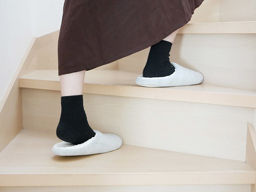 階段の上り下りでよくスリッパが脱げてしまうという女性スタッフも、このニットルームシューズなら脱げない!と感動するほどのフィット感です。