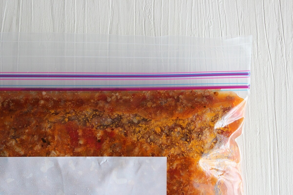 2人前のミートソースをこのように間をあけて冷凍しておくと、簡単に1人前を取り出すことができますね。