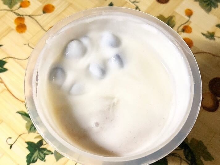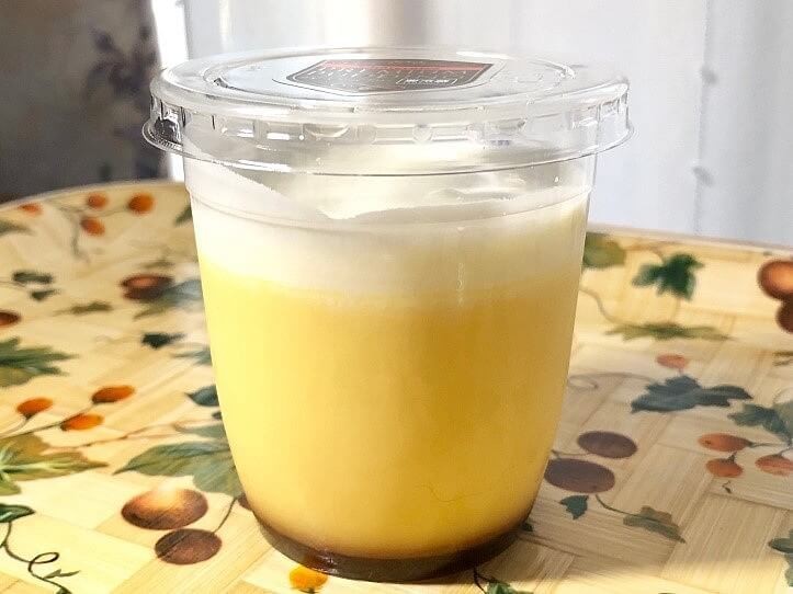 持ち運びのときの振動で中身のタピオカ風のものが片方に寄ってしまいましたが、ふつうに持ち運びさえすればきれいにトッピングされた状態です。タピオカは予想どおりこんにゃくのような食感でした。