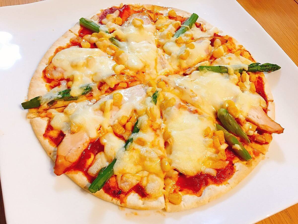 スモークチキンスライス、茹でアスパラガス、コーンをトッピングする
