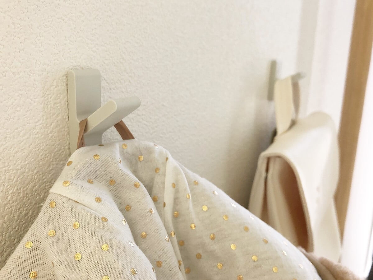 ワンアクション減らしたことでアウターは脱いだらフックに掛けるということが習慣化され、その辺にポイっと脱ぎ散らかすのを防止できます。