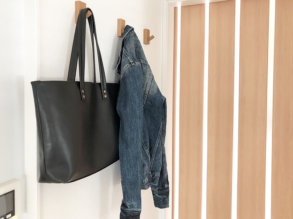 この問題を解決するために、我が家では壁にフックを取り付けてアウターやバッグを掛けられるようにしてみましたので、ここでご紹介します。